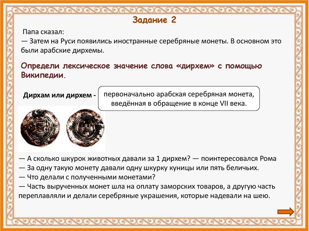 — А сколько шкурок животных давали за 1 дирхем? — поинтересовался Рома
