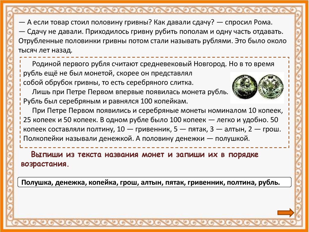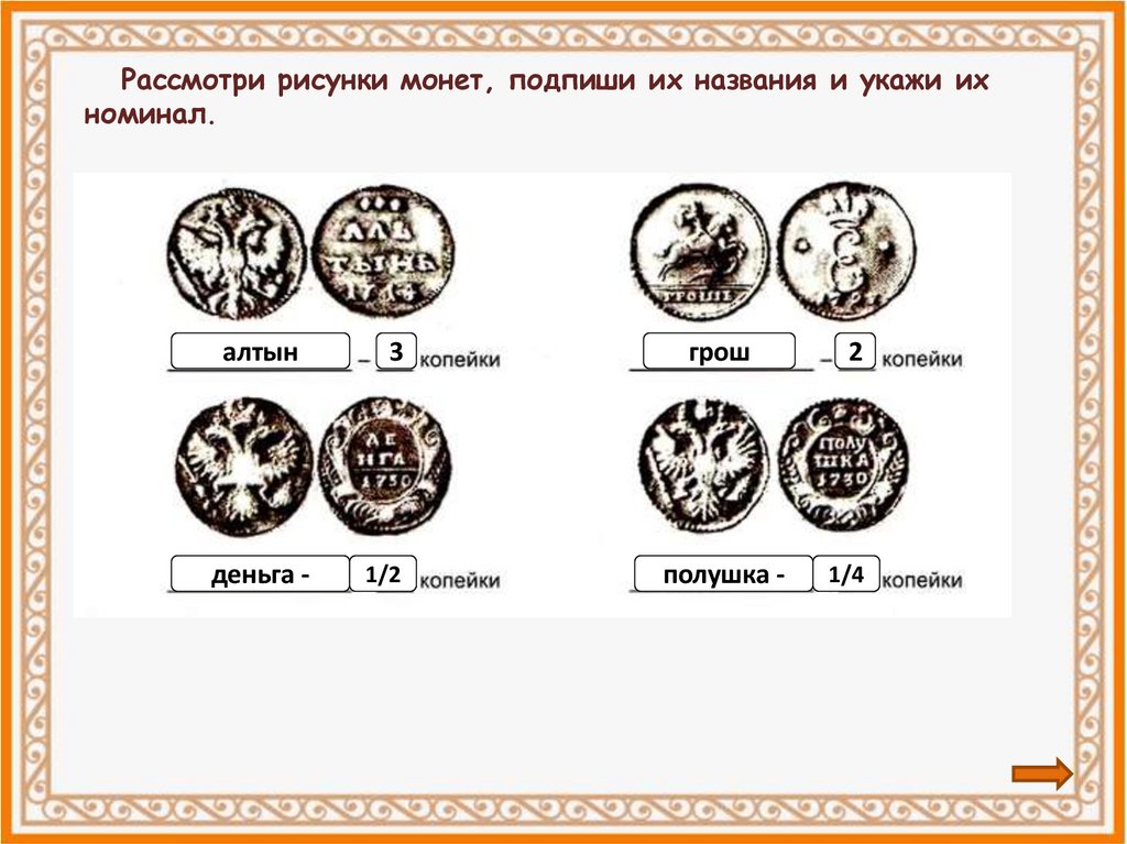 копеек составляли полтину, 10 — гривенник, 5 — пятак, 3 — алтын, 2 — грош.
