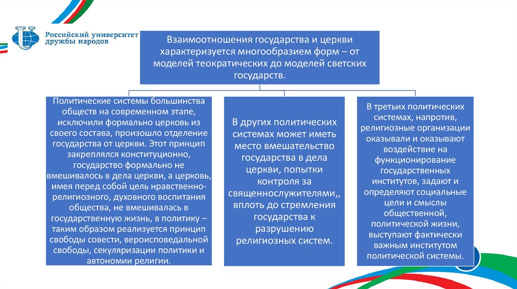 Взаимоотношения государства и церквихарактеризуется многообразием форм – от