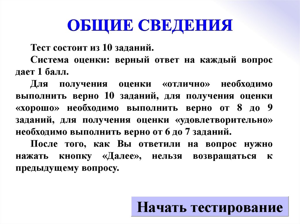 Тест состоит из 10 заданий.Система оценки: верный ответ на каждый вопрос