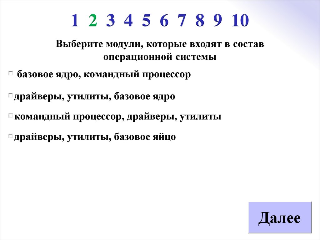 1 2 3 4 5 6 7 8 9 10Выберите модули, которые входят в состав
