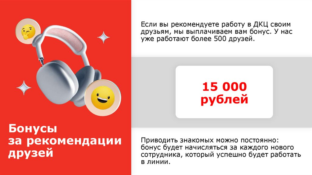 Если вы рекомендуете работу в ДКЦ своимдрузьям, мы выплачиваем вам бонус. У нас
