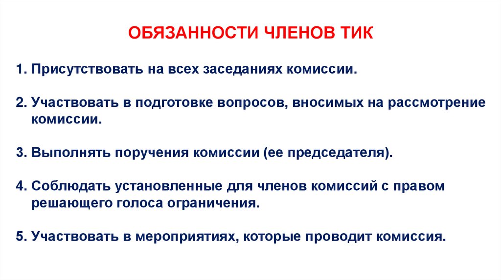 ОБЯЗАННОСТИ ЧЛЕНОВ ТИК1. Присутствовать на всех заседаниях комиссии.
