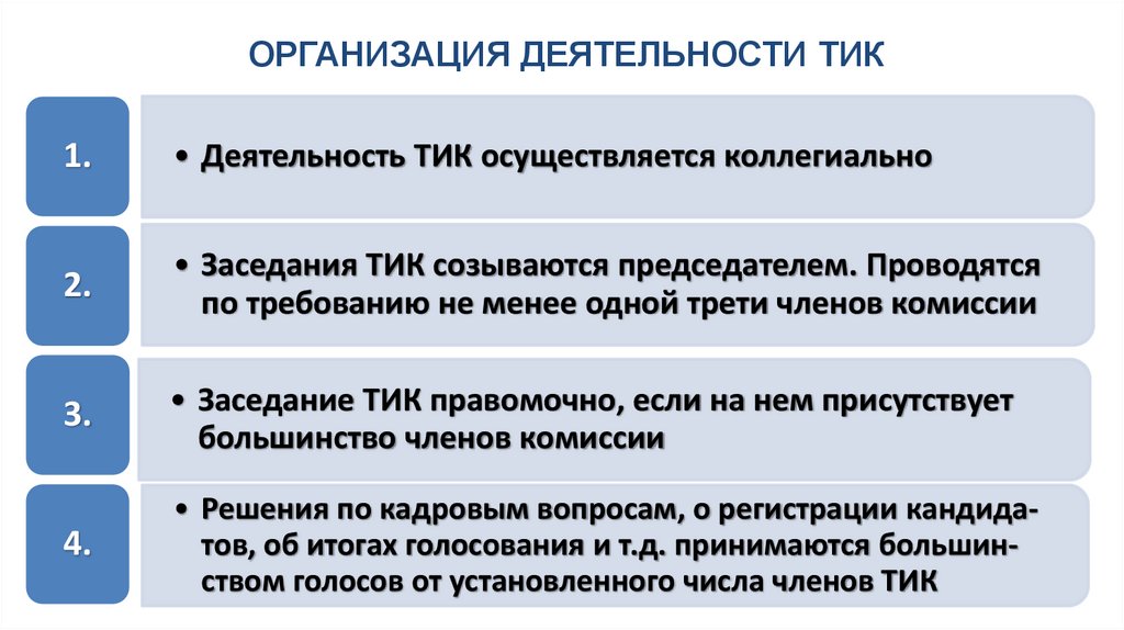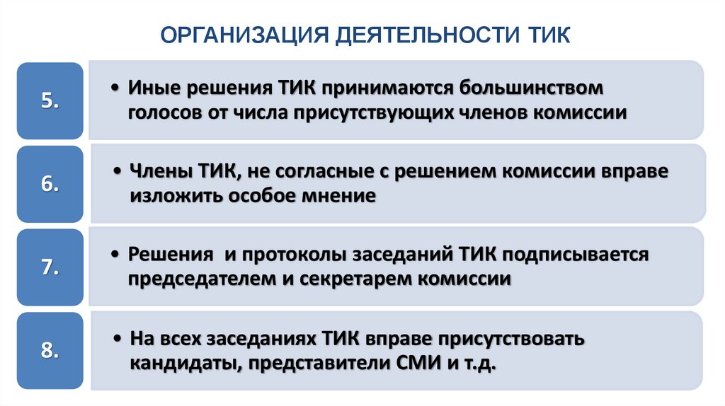 • Решения по кадровым вопросам, о регистрации кандидатов, об итогах голосования и т.д. принимаются большинством голосов от установленного числа членов ТИК