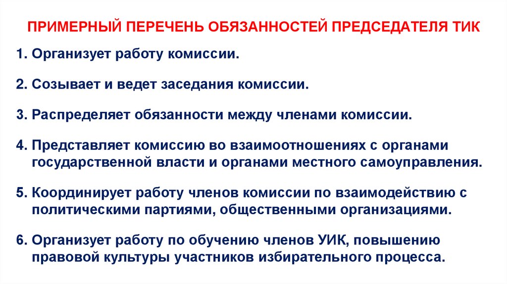 ПРИМЕРНЫЙ ПЕРЕЧЕНЬ ОБЯЗАННОСТЕЙ ПРЕДСЕДАТЕЛЯ ТИК1. Организует работу комиссии.