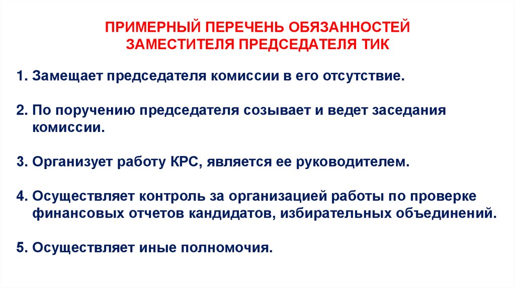 ПРИМЕРНЫЙ ПЕРЕЧЕНЬ ОБЯЗАННОСТЕЙЗАМЕСТИТЕЛЯ ПРЕДСЕДАТЕЛЯ ТИК