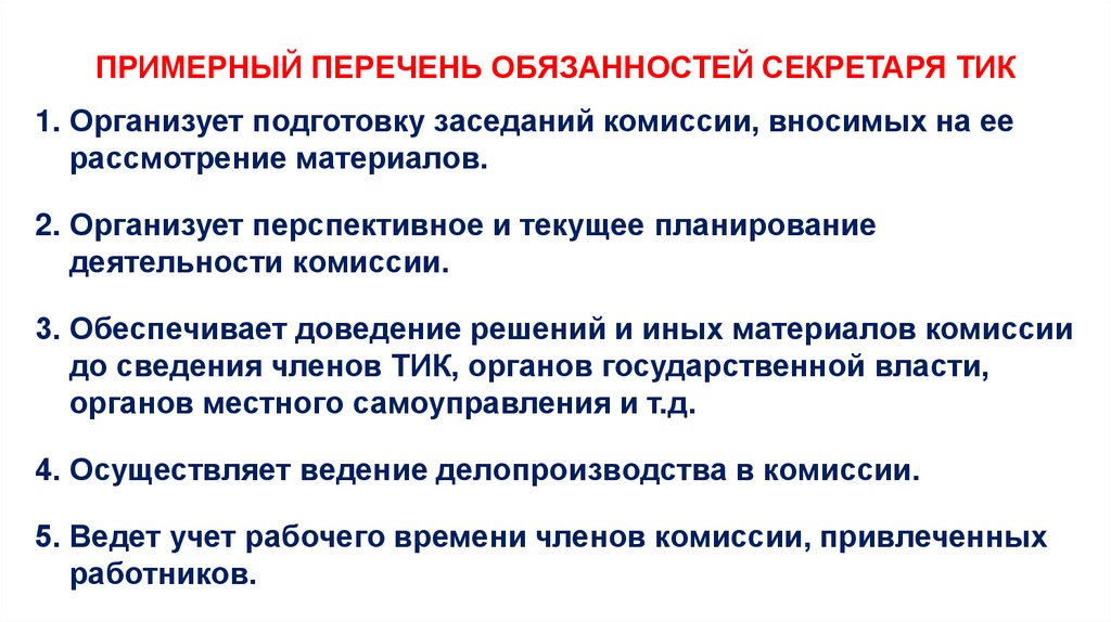 ПРИМЕРНЫЙ ПЕРЕЧЕНЬ ОБЯЗАННОСТЕЙ СЕКРЕТАРЯ ТИК1. Организует подготовку заседаний комиссии, вносимых на ее