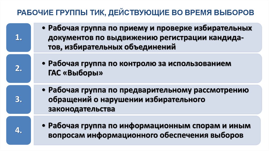 РАБОЧИЕ ГРУППЫ ТИК, ДЕЙСТВУЮЩИЕ ВО ВРЕМЯ ВЫБОРОВ1.
