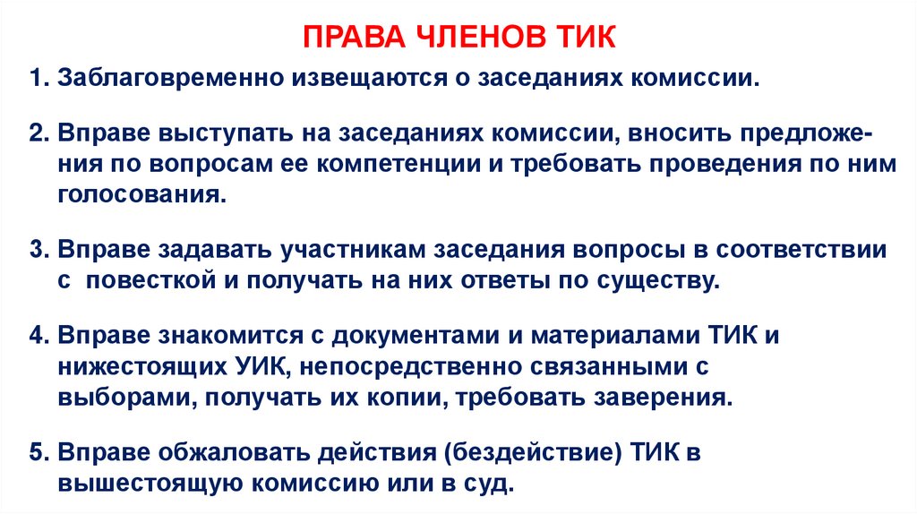 ПРАВА ЧЛЕНОВ ТИК1. Заблаговременно извещаются о заседаниях комиссии.