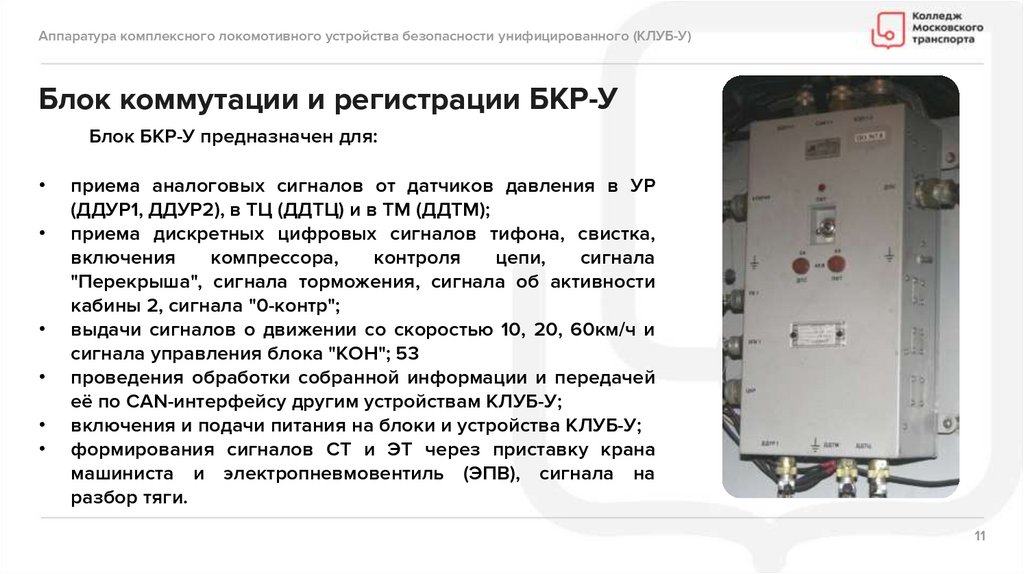 Прием сигналов от систем локомотива: вкл/выкл тяги, о положении крана машиниста и о давлении в ТМ, УР и ТЦ;