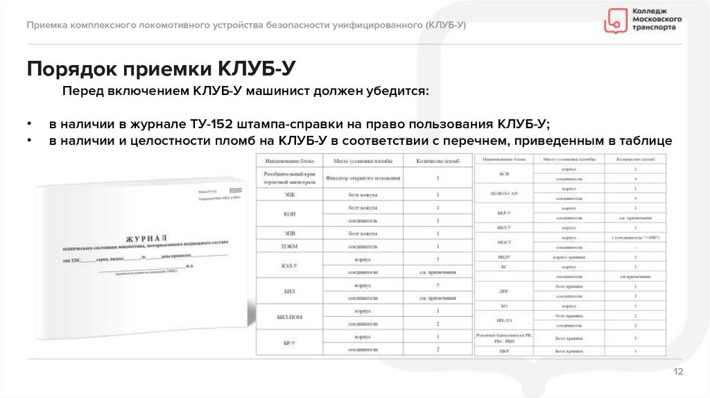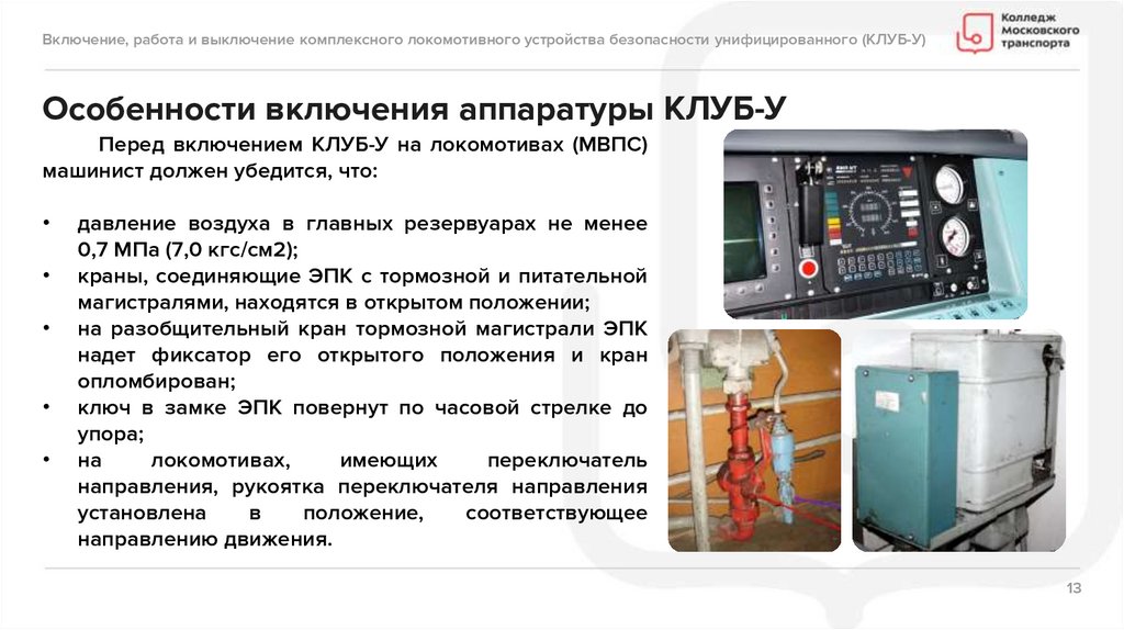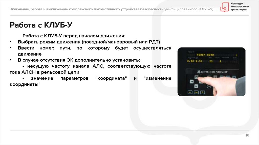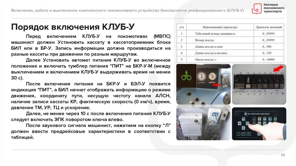 Включение, работа и выключение комплексного локомотивного устройства безопасности унифицированного (КЛУБ-У)Работа с КЛУБ-У