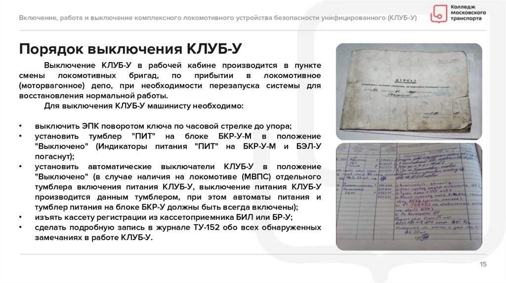 Включение, работа и выключение комплексного локомотивного устройства безопасности унифицированного (КЛУБ-У)Порядок выключения КЛУБ-У