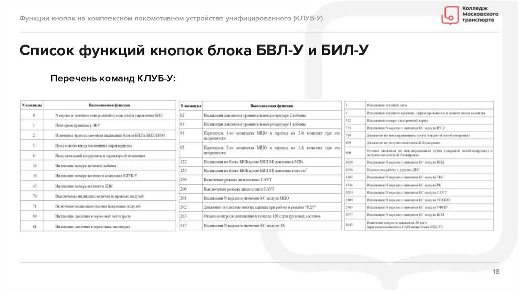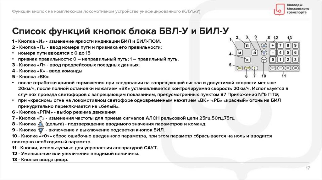 Функции кнопок на комплексном локомотивном устройстве унифицированного (КЛУБ-У)Список функций кнопок блока БВЛ-У и БИЛ-У