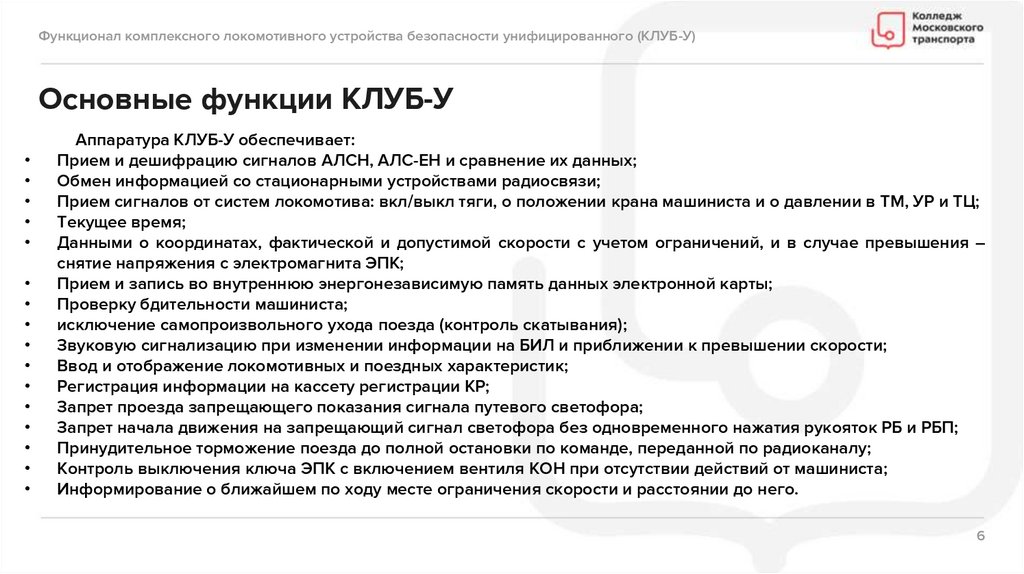 Функционал комплексного локомотивного устройства безопасности унифицированного (КЛУБ-У)Основные функции КЛУБ-У