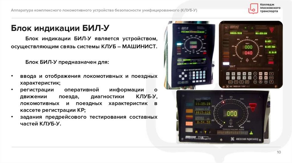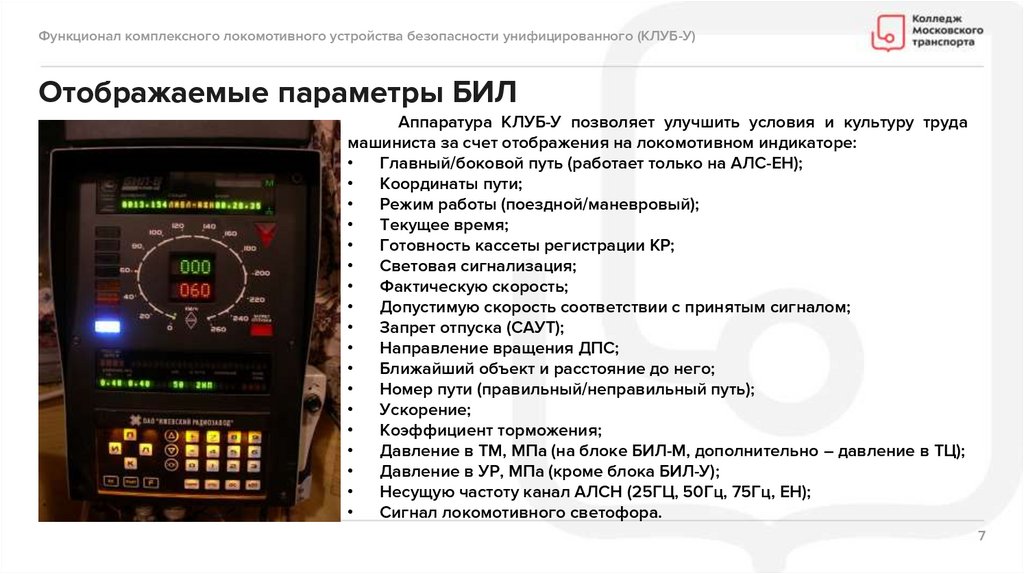 Функционал комплексного локомотивного устройства безопасности унифицированного (КЛУБ-У)Отображаемые параметры БИЛ