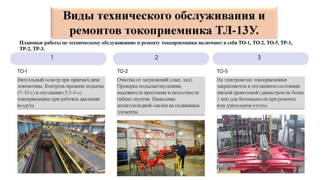 Плановые работы по техническому обслуживанию и ремонту токоприемника включают в себя ТО-1, ТО-2, ТО-5, ТР-1,