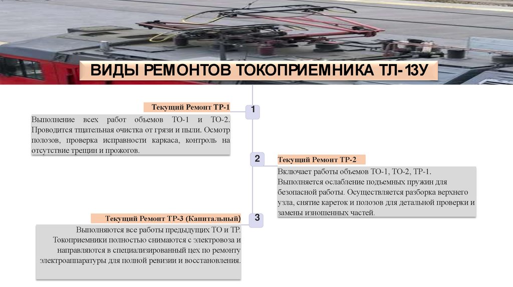 ВИДЫ РЕМОНТОВ ТОКОПРИЕМНИКА ТЛ-13УТекущий Ремонт ТР-1
