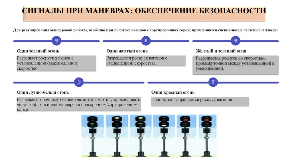 СИГНАЛЫ ПРИ МАНЕВРАХ: ОБЕСПЕЧЕНИЕ БЕЗОПАСНОСТИДля регулирования маневровой работы, особенно при роспуске вагонов с сортировочных горок, применяются специальные световые сигналы.