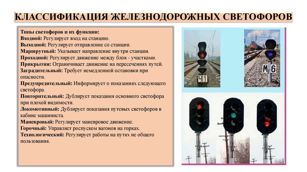 КЛАССИФИКАЦИЯ ЖЕЛЕЗНОДОРОЖНЫХ СВЕТОФОРОВТипы светофоров и их функции: