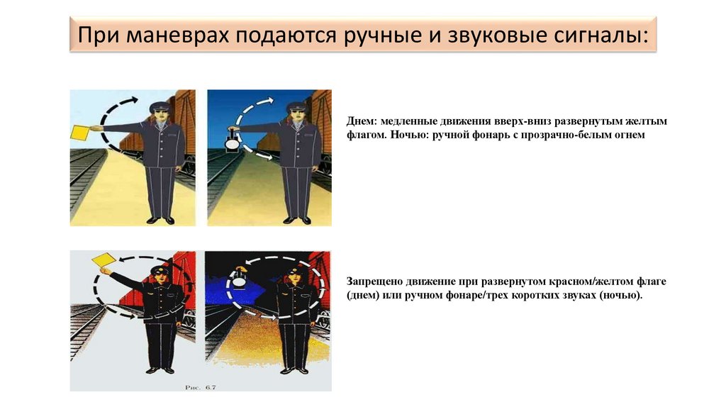 При маневрах подаются ручные и звуковые сигналы:Днем: медленные движения вверх-вниз развернутым желтым