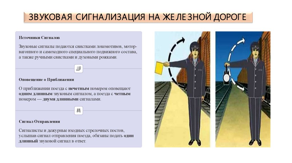 Звуковые сигналы подаются свистками локомотивов, моторвагонного и самоходного специального подвижного состава,