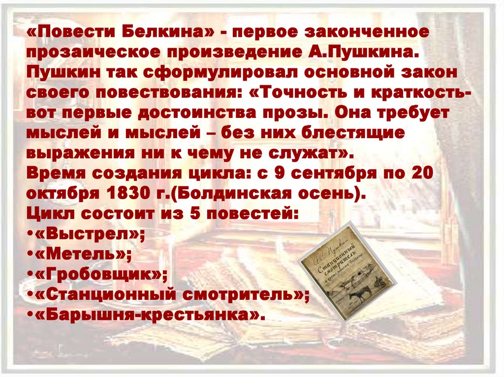 «Повести Белкина» - первое законченноепрозаическое произведение А.Пушкина.