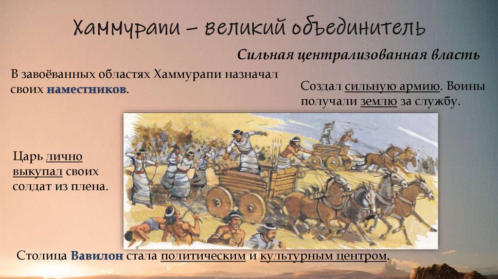 Сильная централизованная властьВ завоёванных областях Хаммурапи назначал
