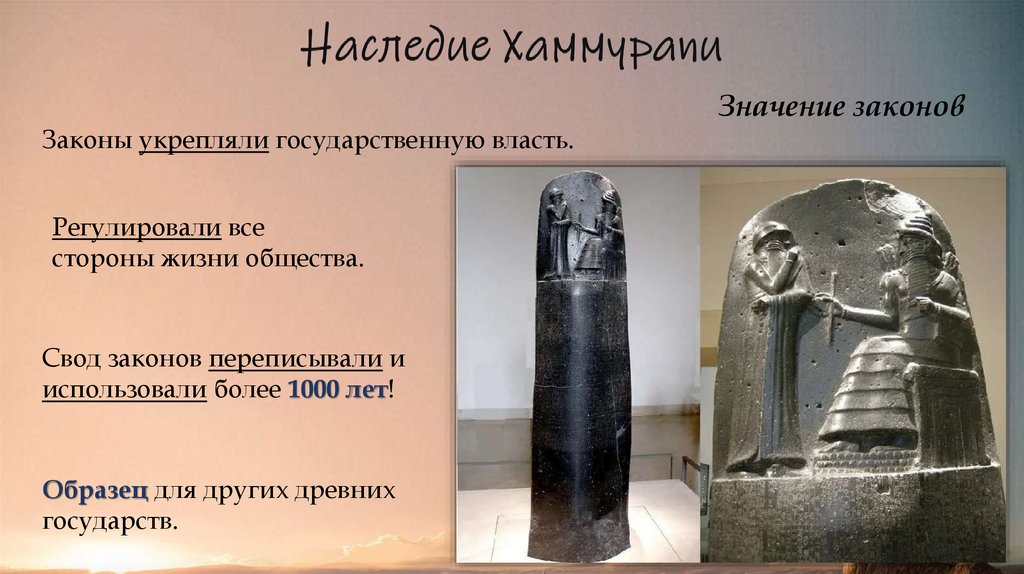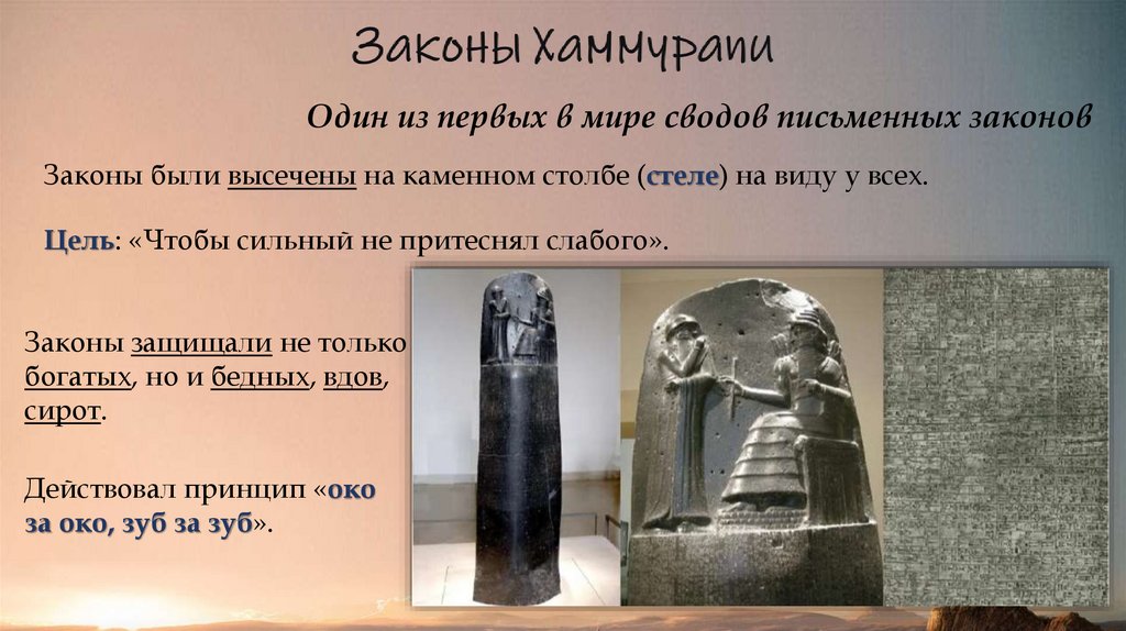 Один из первых в мире сводов письменных законовЗаконы были высечены на каменном столбе (стеле) на виду у всех.