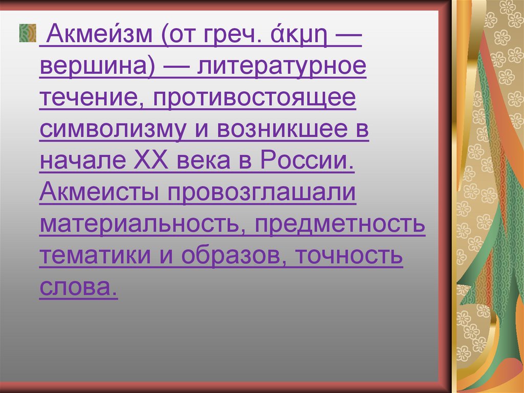 культуры – творчество Блока, Брюсова, Ахматовой,