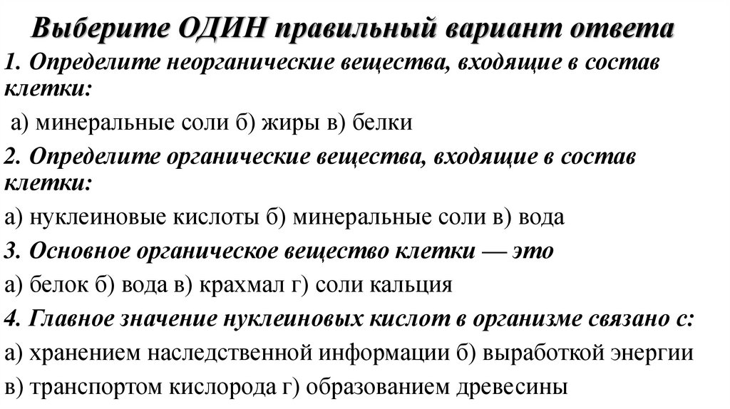 Выберите ОДИН правильный вариант ответа1. Определите неорганические вещества, входящие в состав