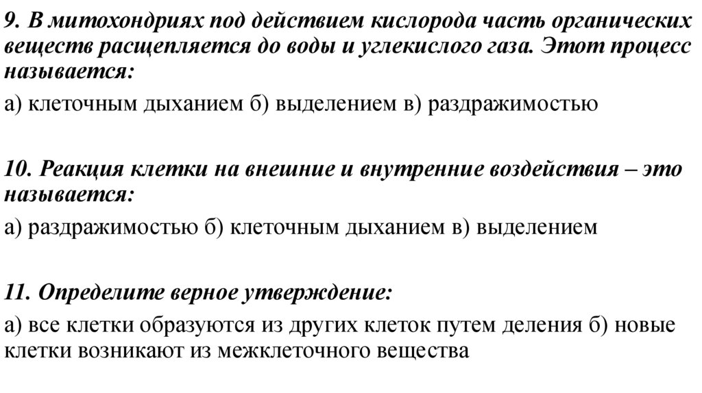9. В митохондриях под действием кислорода часть органическихвеществ расщепляется до воды и углекислого газа. Этот процесс