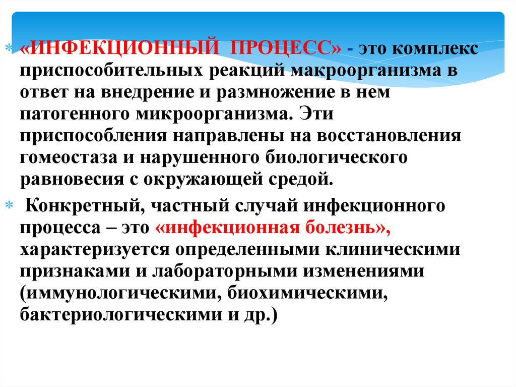 «ИНФЕКЦИОННЫЙ ПРОЦЕСС» - это комплексприспособительных реакций макроорганизма в