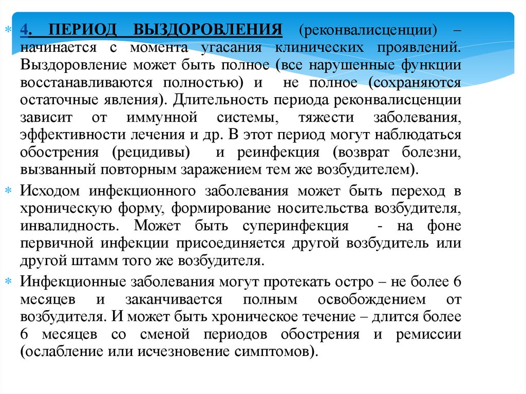 4. ПЕРИОД ВЫЗДОРОВЛЕНИЯ (реконвалисценции) –начинается с момента угасания клинических проявлений.