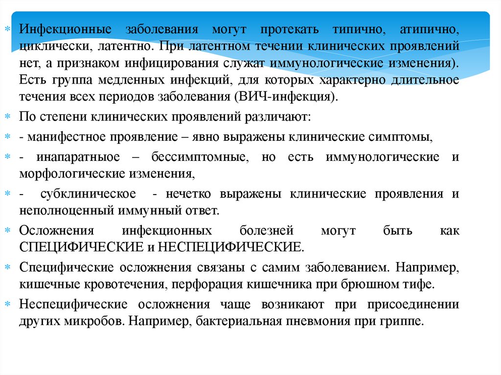 Инфекционные заболевания могут протекать типично, атипично,циклически, латентно. При латентном течении клинических проявлений
