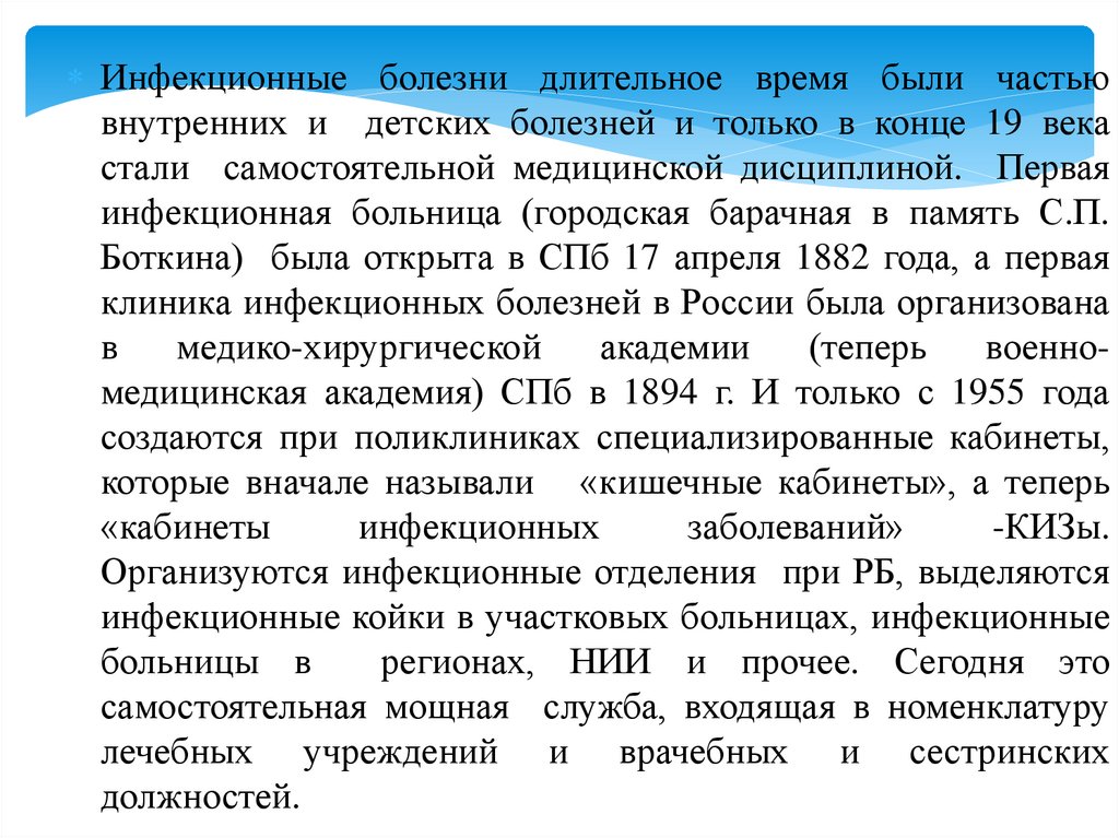 Инфекционные болезни длительное время были частьювнутренних и детских болезней и только в конце 19 века