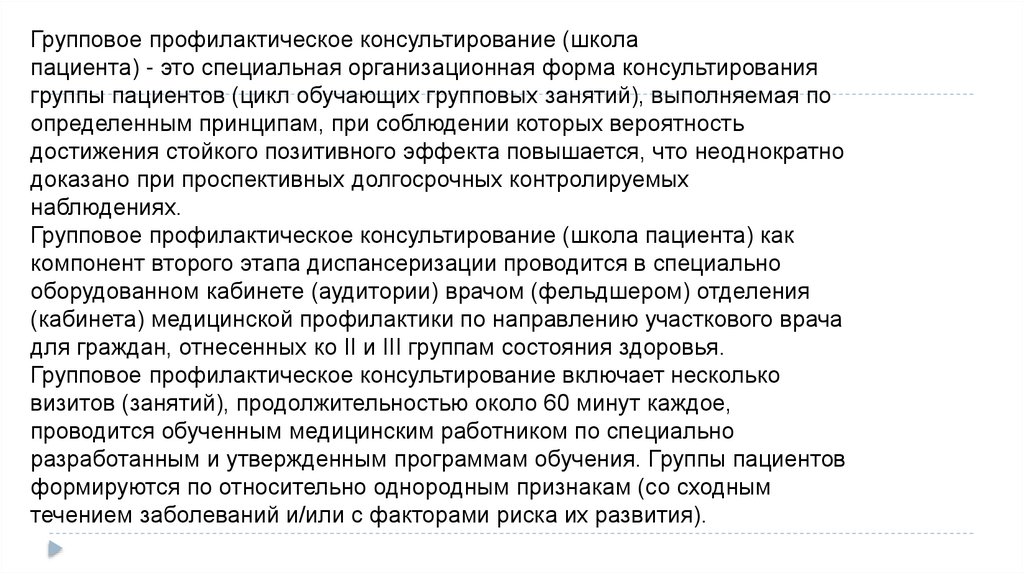 Групповое профилактическое консультирование (школапациента) - это специальная организационная форма консультирования