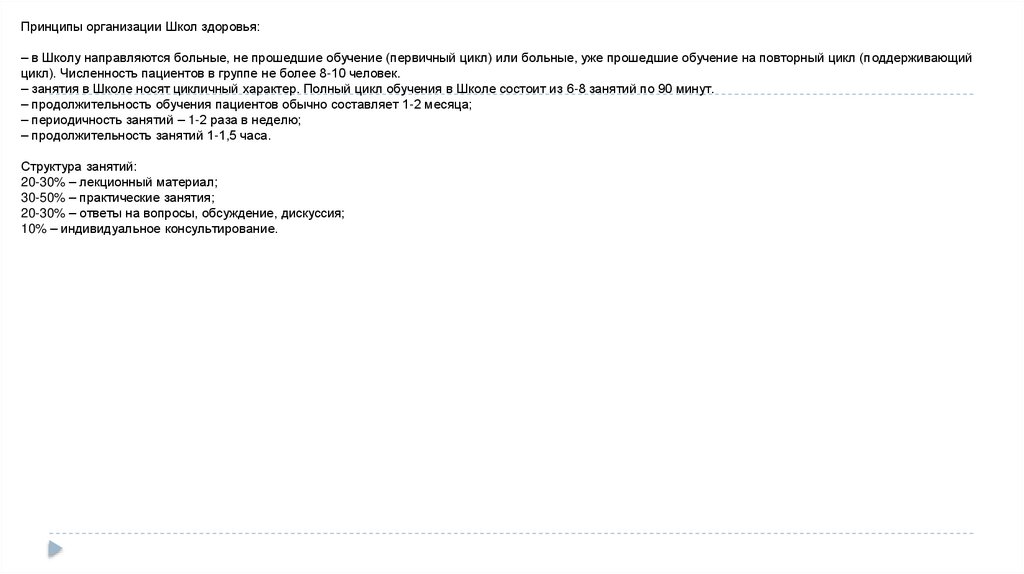 Принципы организации Школ здоровья:– в Школу направляются больные, не прошедшие обучение (первичный цикл) или больные, уже прошедшие обучение на повторный цикл (поддерживающий