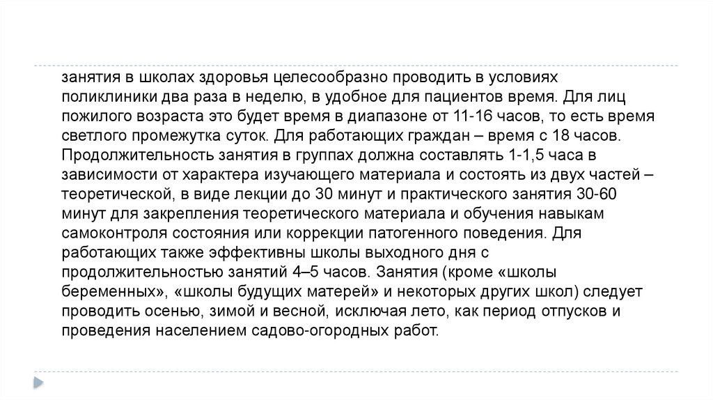 занятия в школах здоровья целесообразно проводить в условияхполиклиники два раза в неделю, в удобное для пациентов время. Для лиц