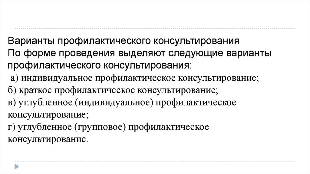 Варианты профилактического консультированияПо форме проведения выделяют следующие варианты
