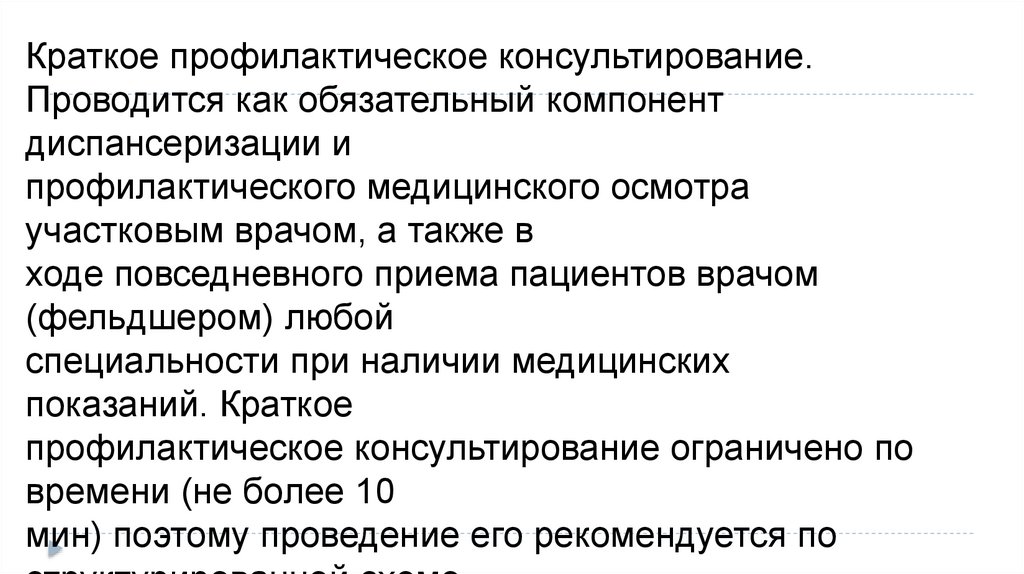Краткое профилактическое консультирование.Проводится как обязательный компонент