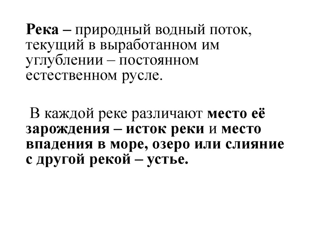 Река – природный водный поток,текущий в выработанном им
