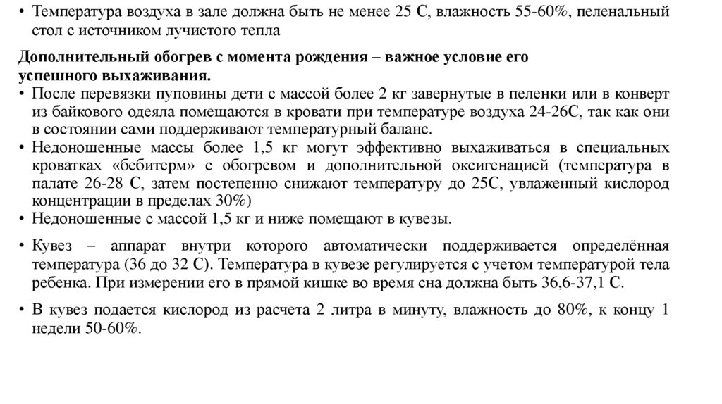Оксигенотерапия: концентрация кислорода 30 %, увлажненность 80-100 %, подогрета до 24 %.