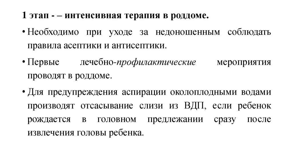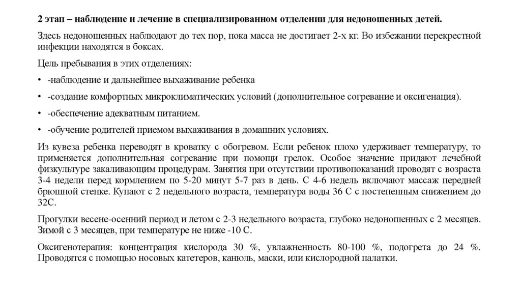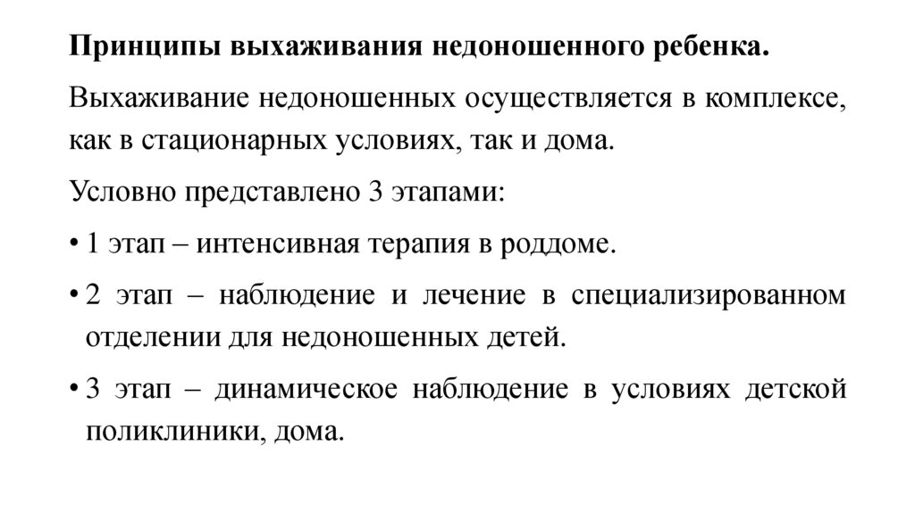 Принципы выхаживания недоношенного ребенка.Выхаживание недоношенных осуществляется в комплексе,