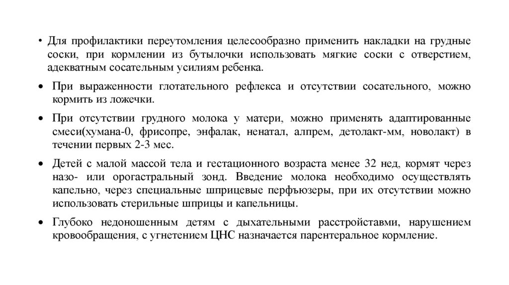 • Для профилактики переутомления целесообразно применить накладки на грудныесоски, при кормлении из бутылочки использовать мягкие соски с отверстием,