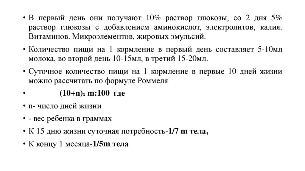 • В первый день они получают 10% раствор глюкозы, со 2 дня 5%раствор глюкозы с добавлением аминокислот, электролитов, калия.