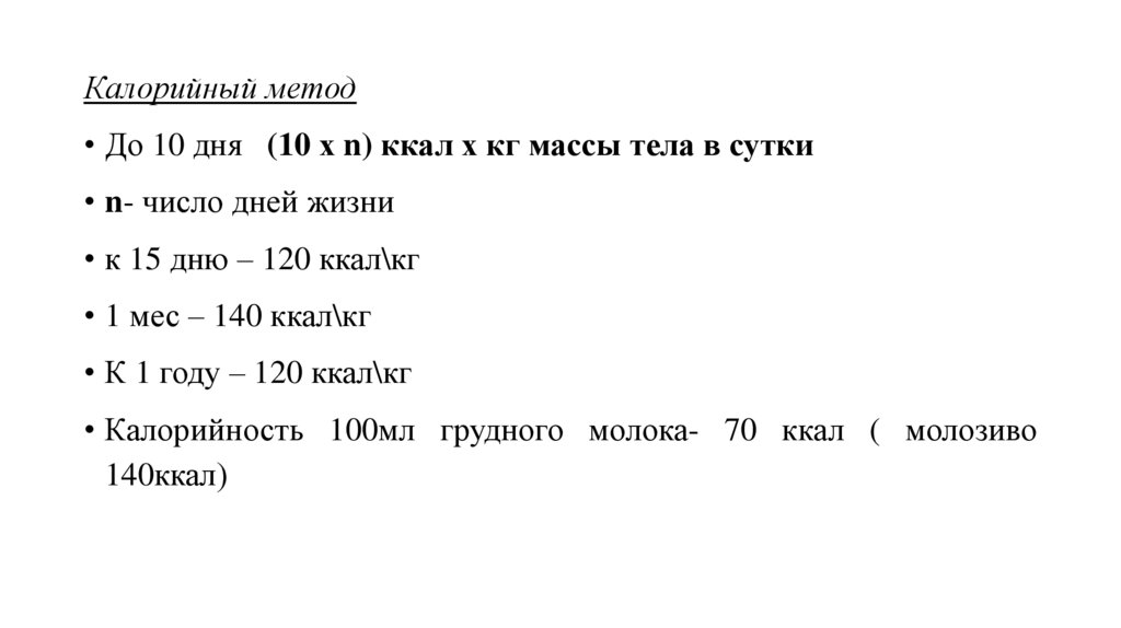 Калорийный метод• До 10 дня (10 х n) ккал х кг массы тела в сутки