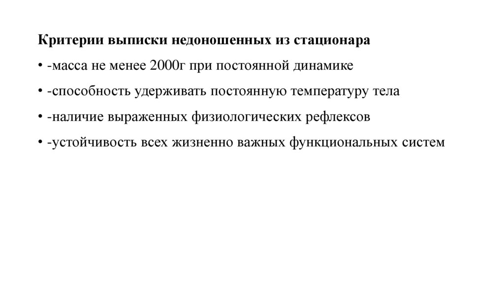 Критерии выписки недоношенных из стационара• -масса не менее 2000г при постоянной динамике