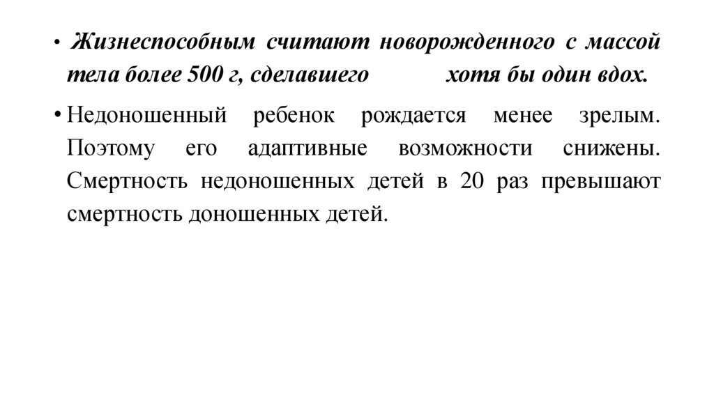 • Жизнеспособным считают новорожденного с массойтела более 500 г, сделавшего