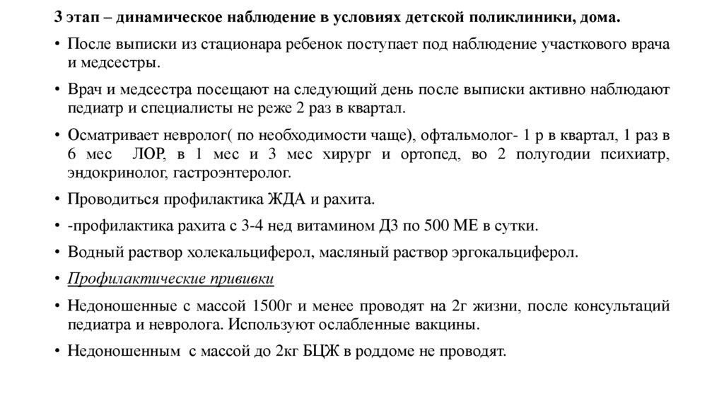 3 этап – динамическое наблюдение в условиях детской поликлиники, дома.• После выписки из стационара ребенок поступает под наблюдение участкового врача