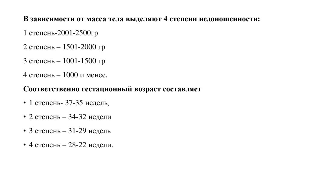 В зависимости от масса тела выделяют 4 степени недоношенности:1 степень-2001-2500гр